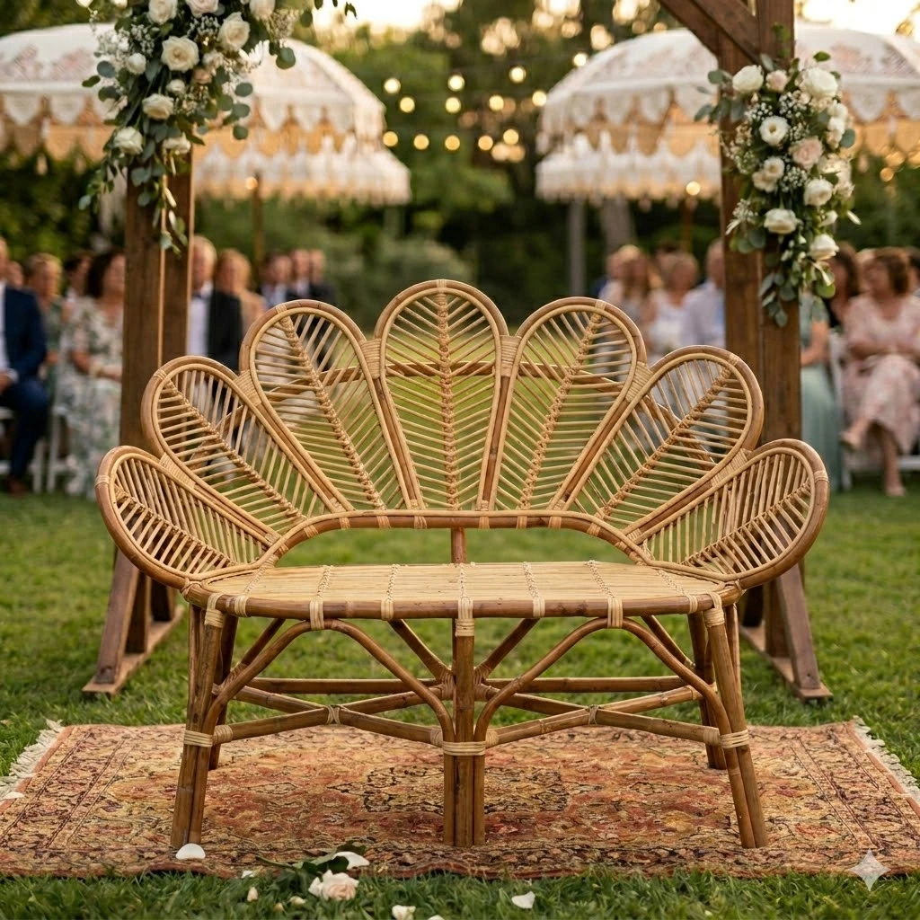 Banquette fleur en rotin, alliant charme naturel et design raffiné. Avec son dossier en forme de pétales, elle apporte une touche bohème et élégante à tout espace intérieur ou extérieur. Confortable et légère, cette pièce unique est parfaite pour créer une ambiance chaleureuse et tendance pour un coin repos ou votre cérémonie laïque.